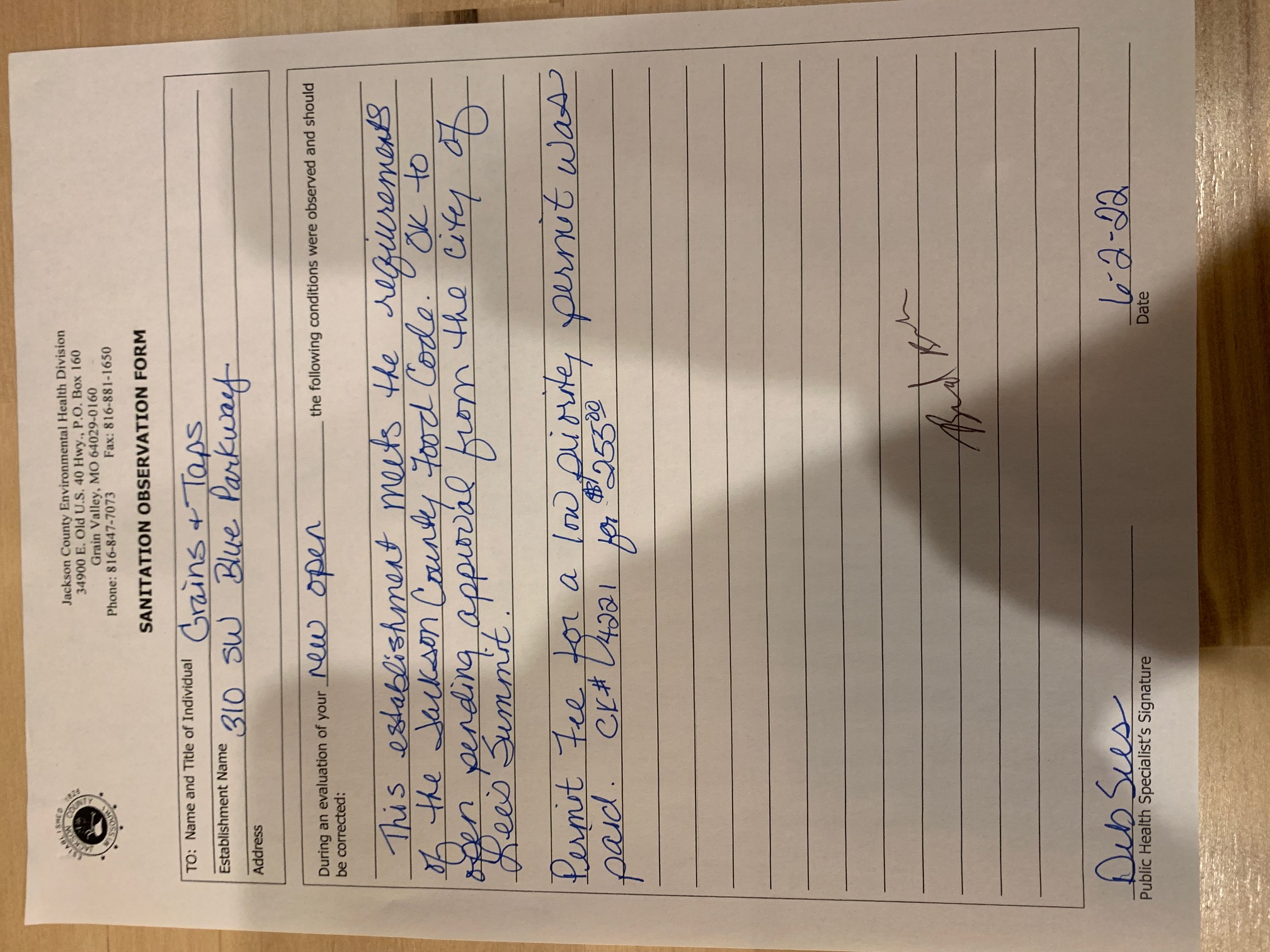 For the Health Department inspection contact Deb Sees with the Jackson County Public Works Department, Environmental Health Division at (816) 847-7070. Health Department approval is required prior to receiving any type of Occupancy from the City of Lee's Summit.