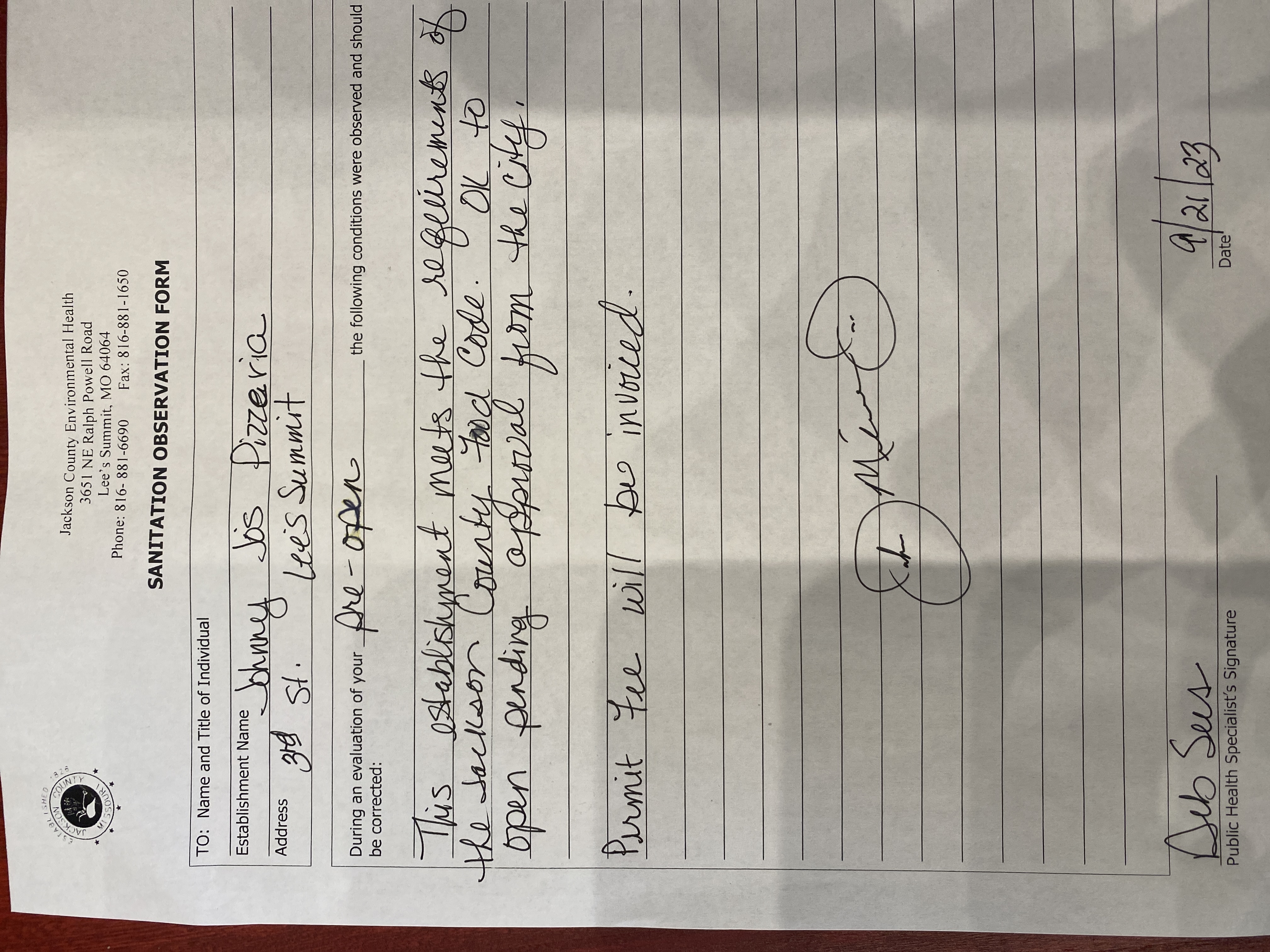 For the Health Department inspection contact Deb Sees with the Jackson County Public Works Department, Environmental Health Division at (816) 847-7070. Health Department approval is required prior to receiving any type of Occupancy from the City of Lee's Summit.