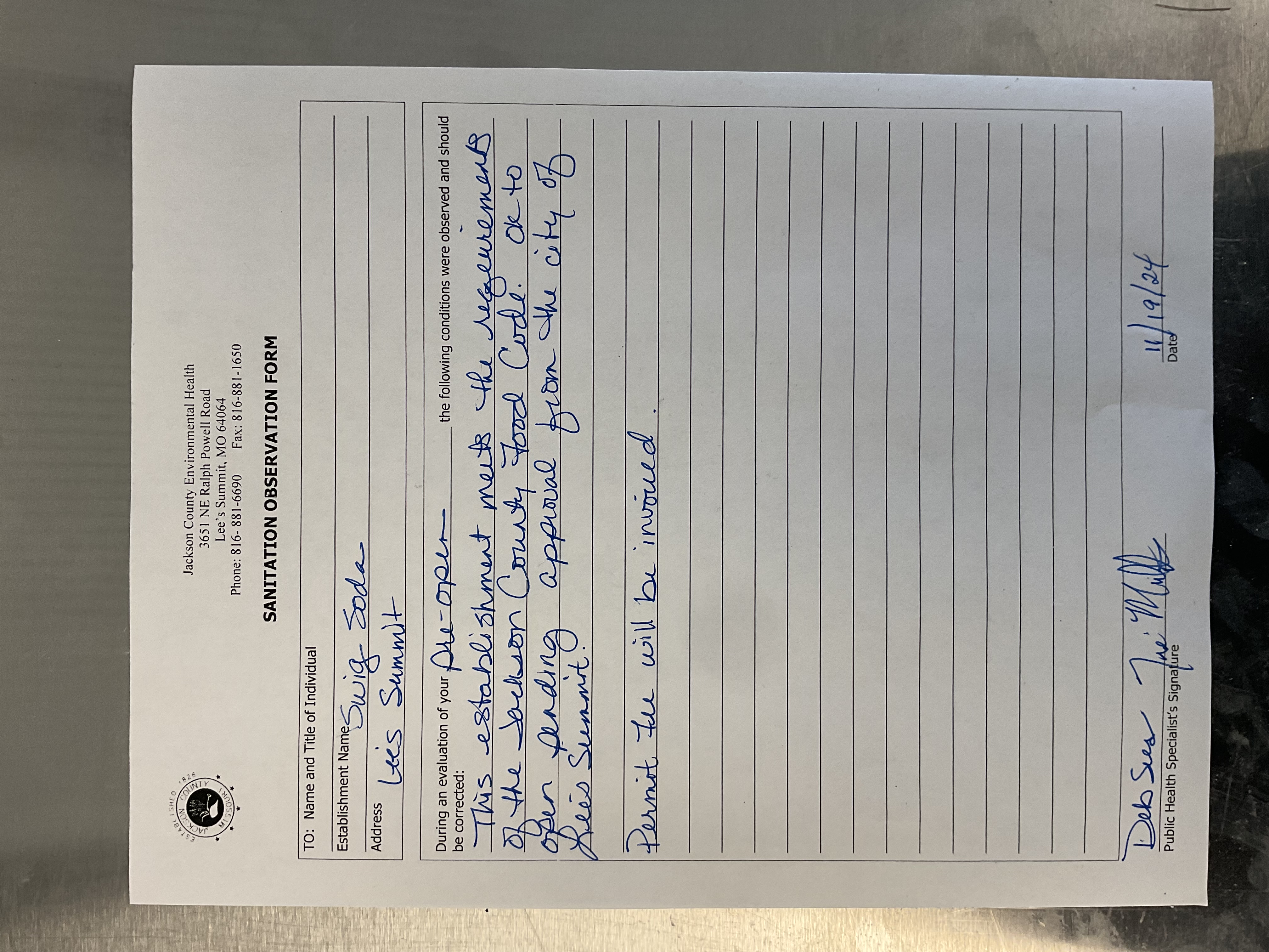 For the Health Department inspection contact Deb Sees with the Jackson County Public Works Department, Environmental Health Division at (816) 797-7162. Health Department approval is required prior to receiving any type of Occupancy from the City of Lee's Summit.